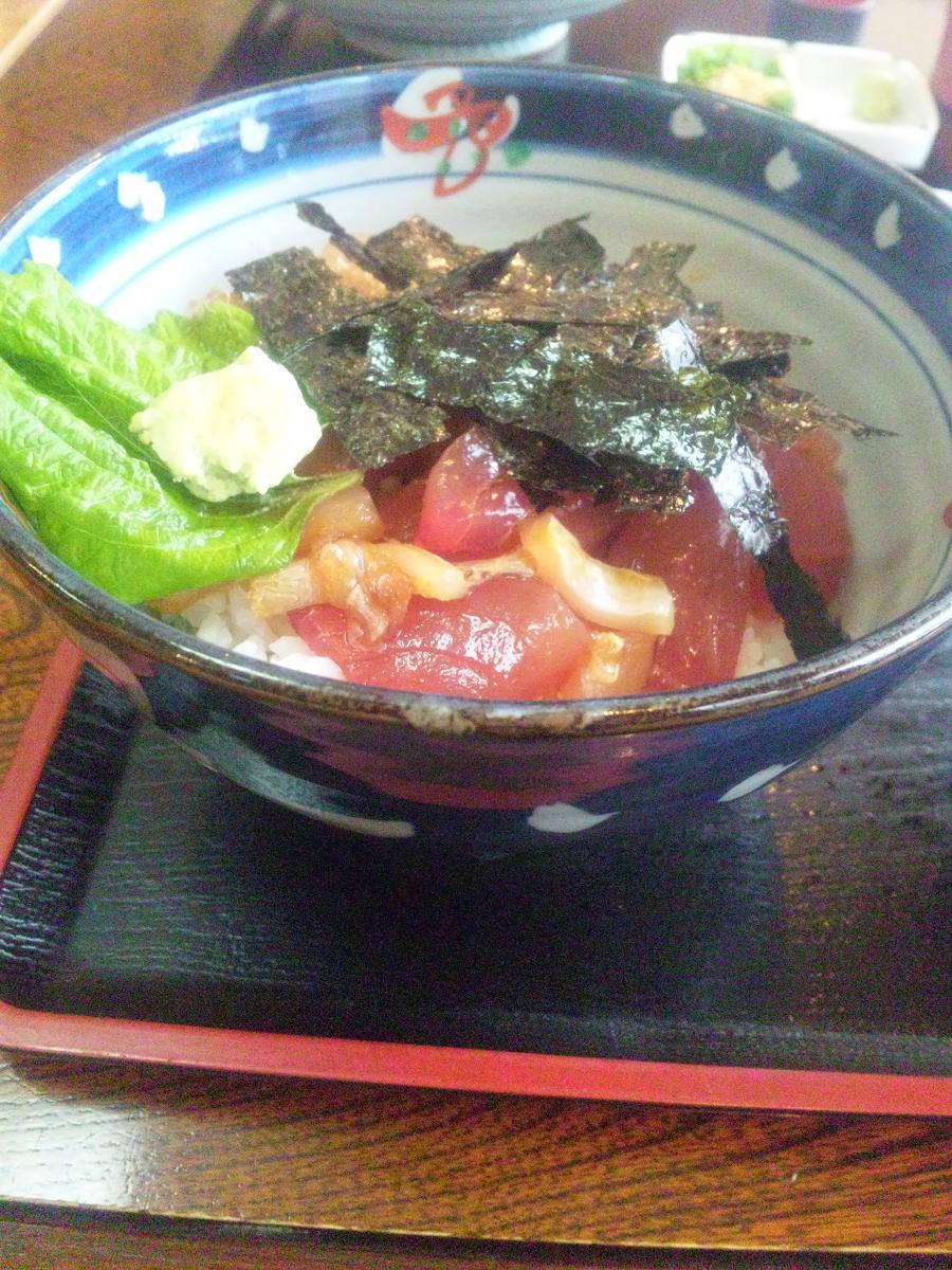 仕方ないので腹ごしらえで駅近くのお食事処へ。勝浦港直送のマグロ丼うまかった!